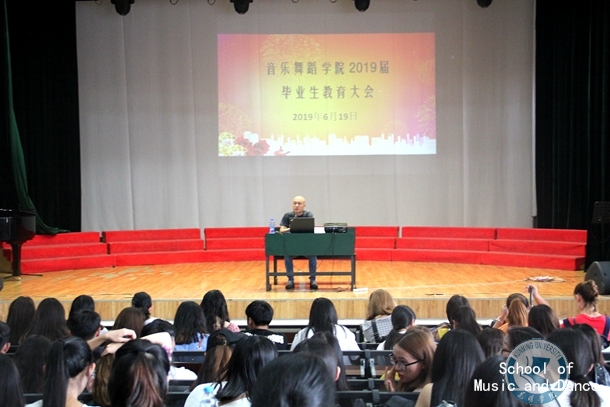 2019年6月19日下午,wedvictor伟德在音乐楼实践教室对2019届毕业生进行离校期间的文明安全教育, 确保毕业生离校求职期间的安全稳定。参加此次教育会的有党总支书记杨爱民、党总支副书记兼副经理(主持行政工作)黄清林、副经理龚婷、团总支负责人罗银伟、辅导员周丹,以及全体毕业生和班主任。